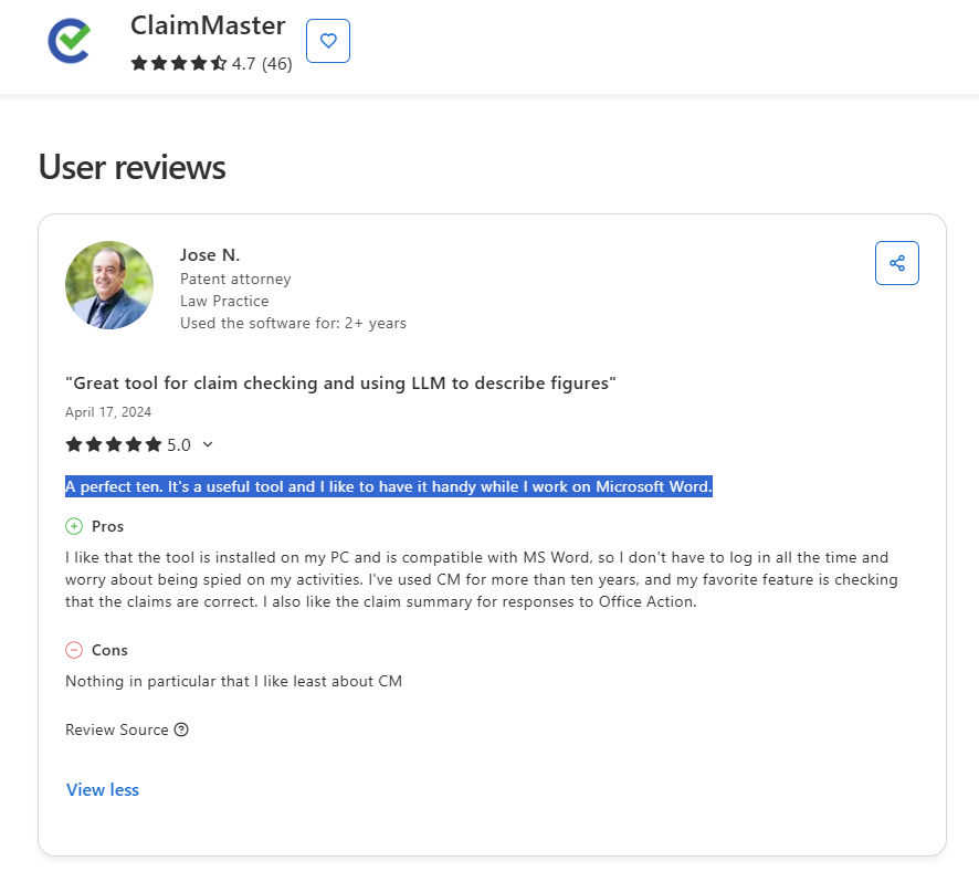 - Performance on large files: Processing large or complex patent documents may slow down ClaimMaster’s performance, especially during extensive error checks. Users have noted delays and limited multitasking within Word when handling lengthy applications.