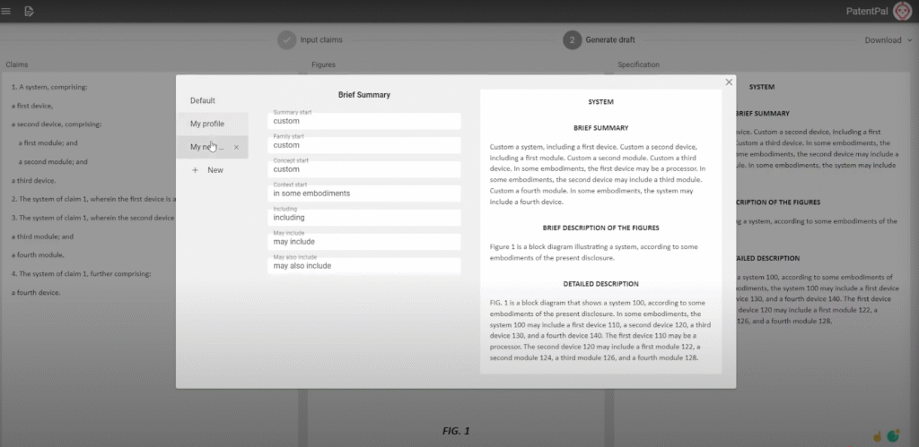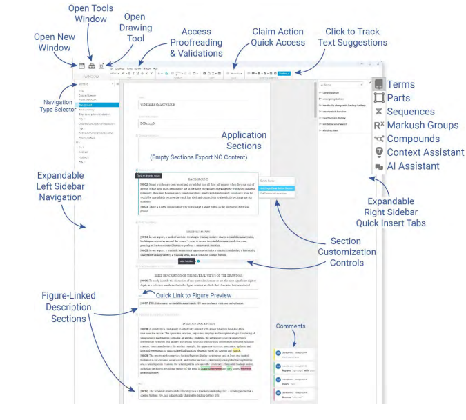 - AI-driven Automated Proofreading: Scans and generates patent drafts with a focus on catching errors, inconsistencies, and missing details in application documents.