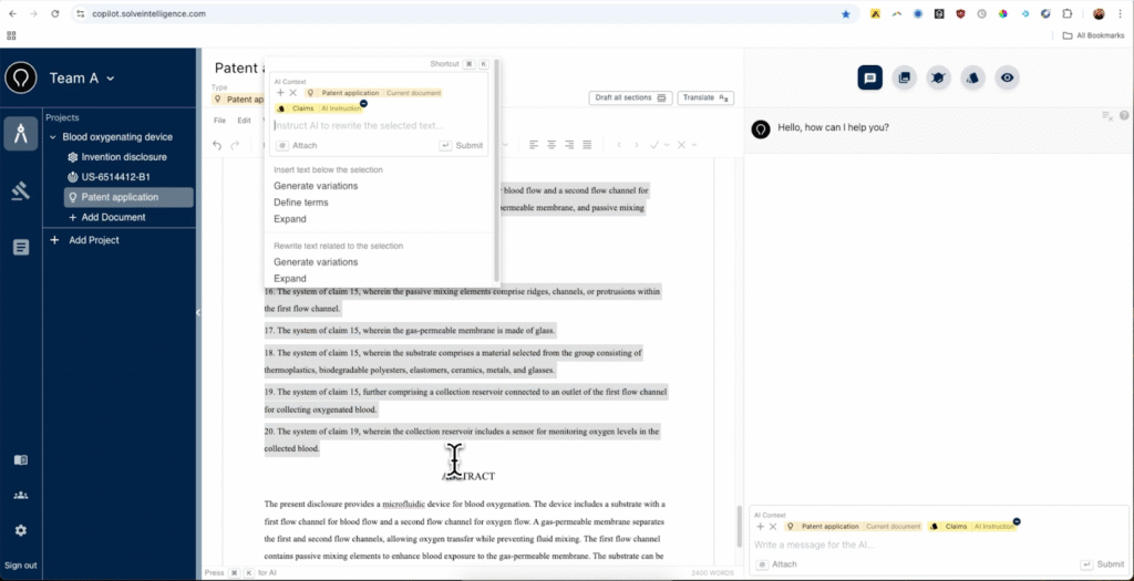 Solve Intelligence provides a cloud-based AI solution for patent proofreading that integrates directly into the patent workflow. Attorneys use the platform to detect errors, ensure claim support, verify consistency, and comply with jurisdictional requirements—all within a version-controlled and auditable environment.