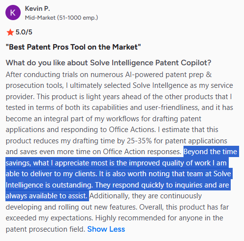 On G2, one reviewer described Solve Intelligence as “light-years ahead” of other tools—highlighting its speed (reportedly 25–35% faster), intuitive interface and responsive support team.