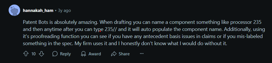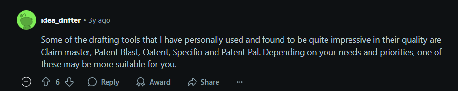 On Reddit’s r/Patents, one practitioner mentioned: “Some of the drafting tools that I have personally used and found impressive are ClaimMaster, Patent Blast, Qatent, Specifio, and PatentPal.”